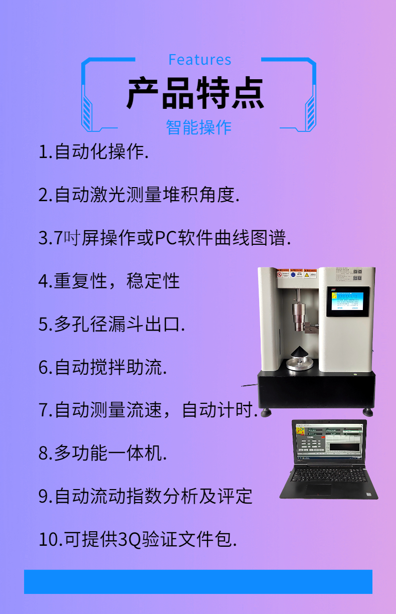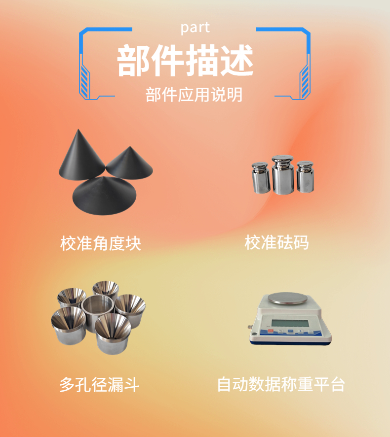 5. 多孔徑漏斗出口.能測試不同粉體流動性.